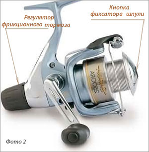 В катушке с задним расположением тормоза (фото 2), вместо ручки его регулятора расположена кнопка фиксатора шпули, нажатием на которую она легко снимается.