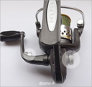 Большинство моделей безынерционных катушек оснащены кнопочной системой складывания рукояти, позволяющей ее быстро складывать легким нажатием на кнопку, и винтовым механизмом для снятия или перестановки рукояти на другую сторону катушки (фото 4). Для этих целей на БК имеется головка винтового механизма, размещенная с противоположной стороны рукояти, позволяющая без особых усилий управлять винтом.