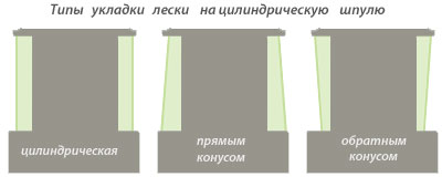 На рисунке изображены три типа формы укладки лески на цилиндрическую шпулю: