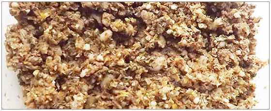 В первую очередь смешиваем все сухие, предварительно просеянные компоненты: отруби, овсяную и рыбную муку, сухари, семечки, жмых, печенье, соль, соду. Готовую сухую смесь высыпаем в пластиковое ведро, закрывая крышкой или большой целлофановый пакет.