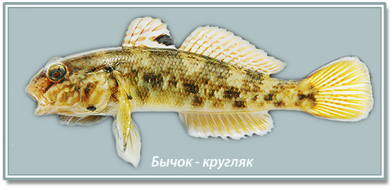 Бычок кругляк - длина тела от 15 см д о 27 см, весит до 270 г. Имеет внешнее сходство с предыдущими видами. Отличается небольшими размерами рта конечной формы и четким темным пятном на краю спинного плавника. Окраска от серовато- бежевой до темно бурой и даже черной.