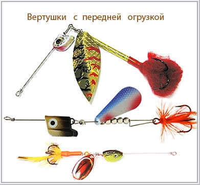 переднеогруженные вращающиеся блесна - груз размещен перед лепестком. Расположение огрузки в конструкции блесны достаточно серьезно влияет на ее поведение в рабочем состоянии и требует особого подхода и разных способов проводки.
