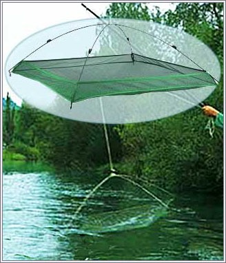 Подъемник, или как его еще называют "паук", представляет собой круглый или квадратный сочок с мелкими ячейками, подвешенный к шесту. Устанавливают его в предполагаемом месте укрытия малька, это могут быть заросли осоки или камыша, на глубине не менее 0.5 м, чтобы он был незаметен с поверхности водоема, предварительно привязав в центре его рабочей части мелкосетчатый мешочек с привадой.